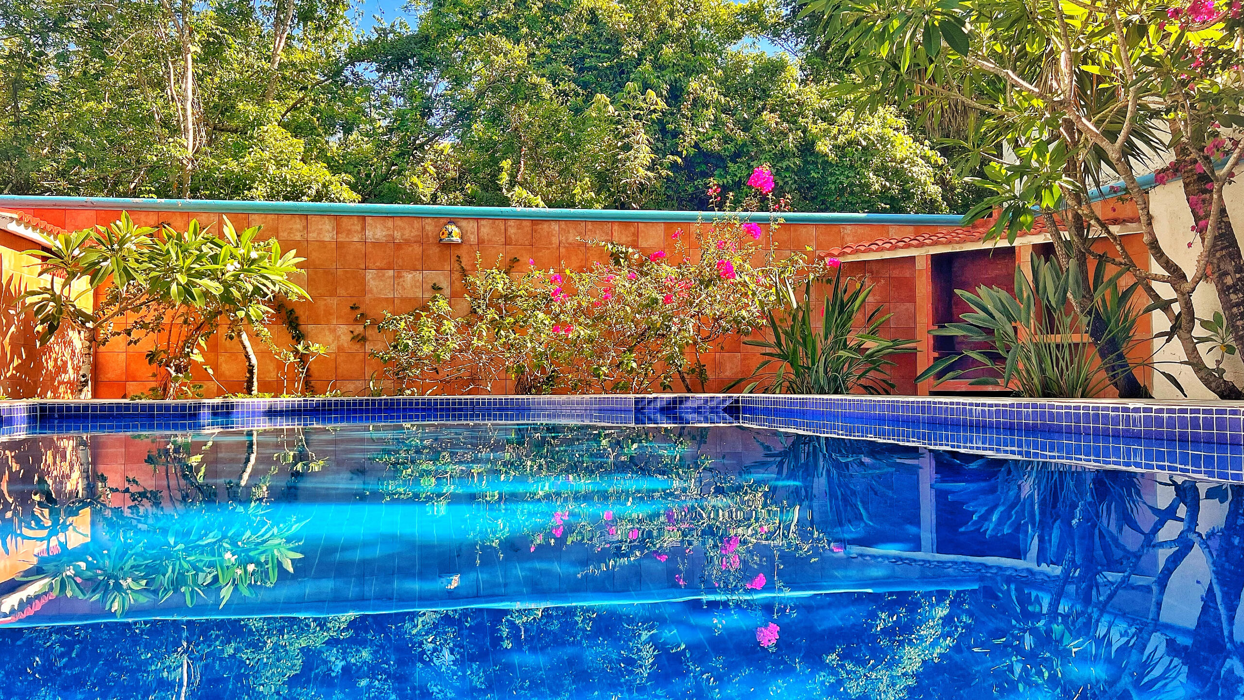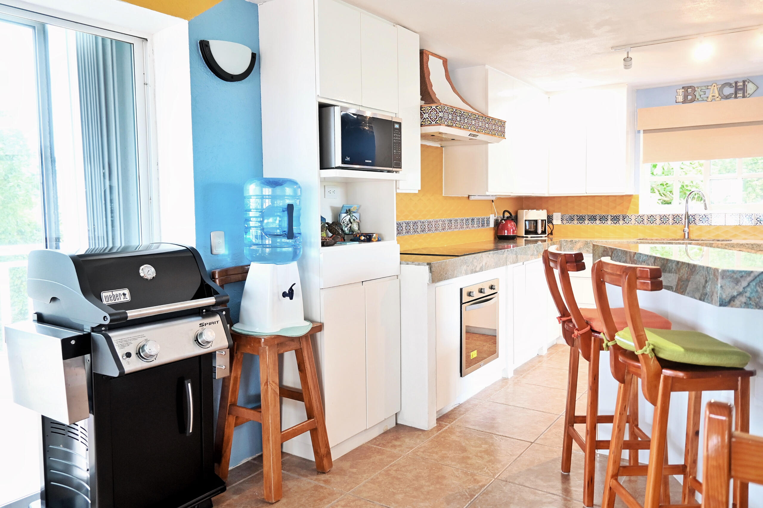 Villa Serenidad’s private poolside is lined with beach loungers & hammocks for snoozing, sunbathing, or staying cool in the shade.The backyard space includes a kitchen & dining area with a fridge, sink, and wood fire grill perfect for cooking up the catch of the day.