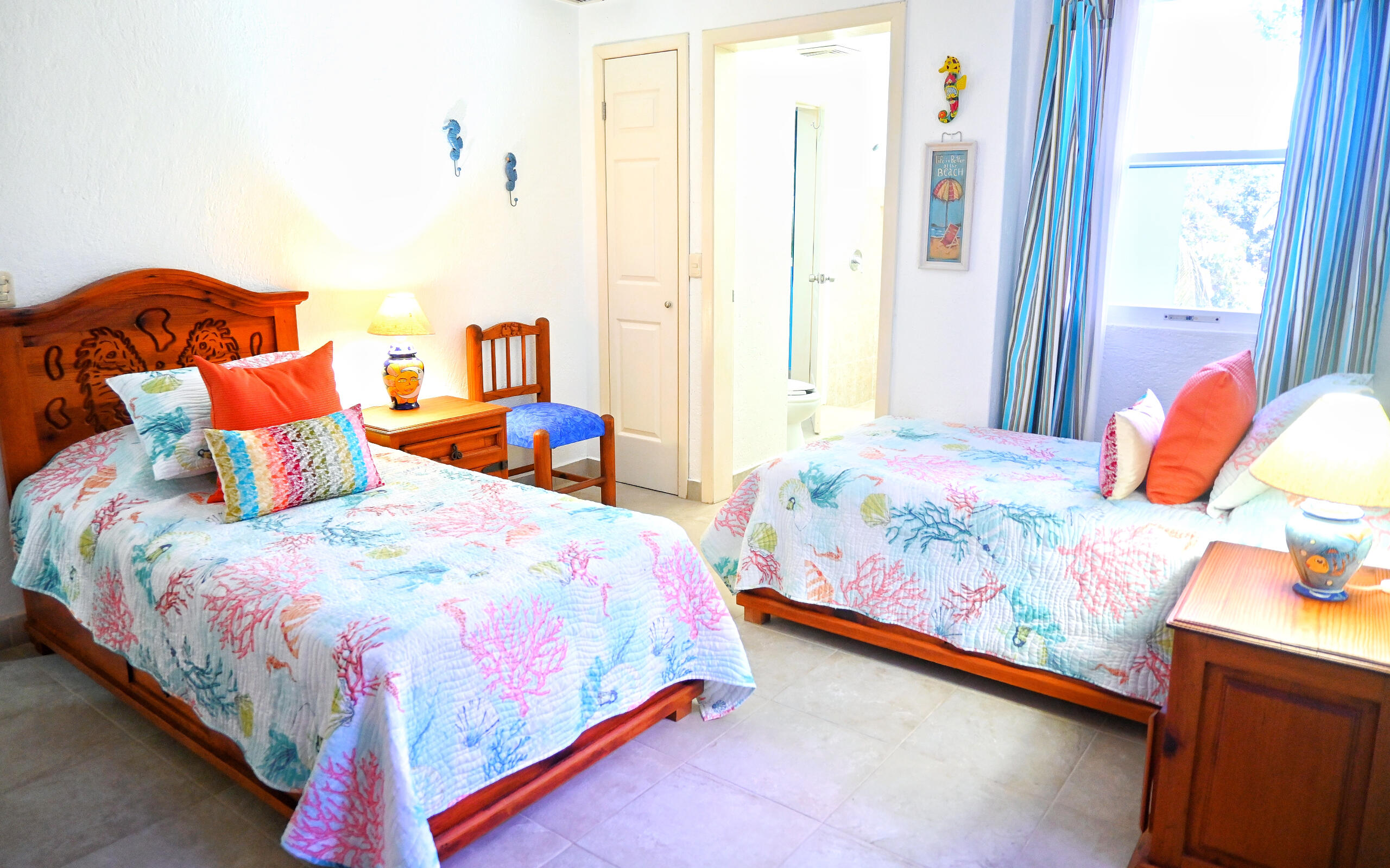 The first bedroom on the main level offers 2 twin beds and is connected to bedroom 2 via shared ensuite.