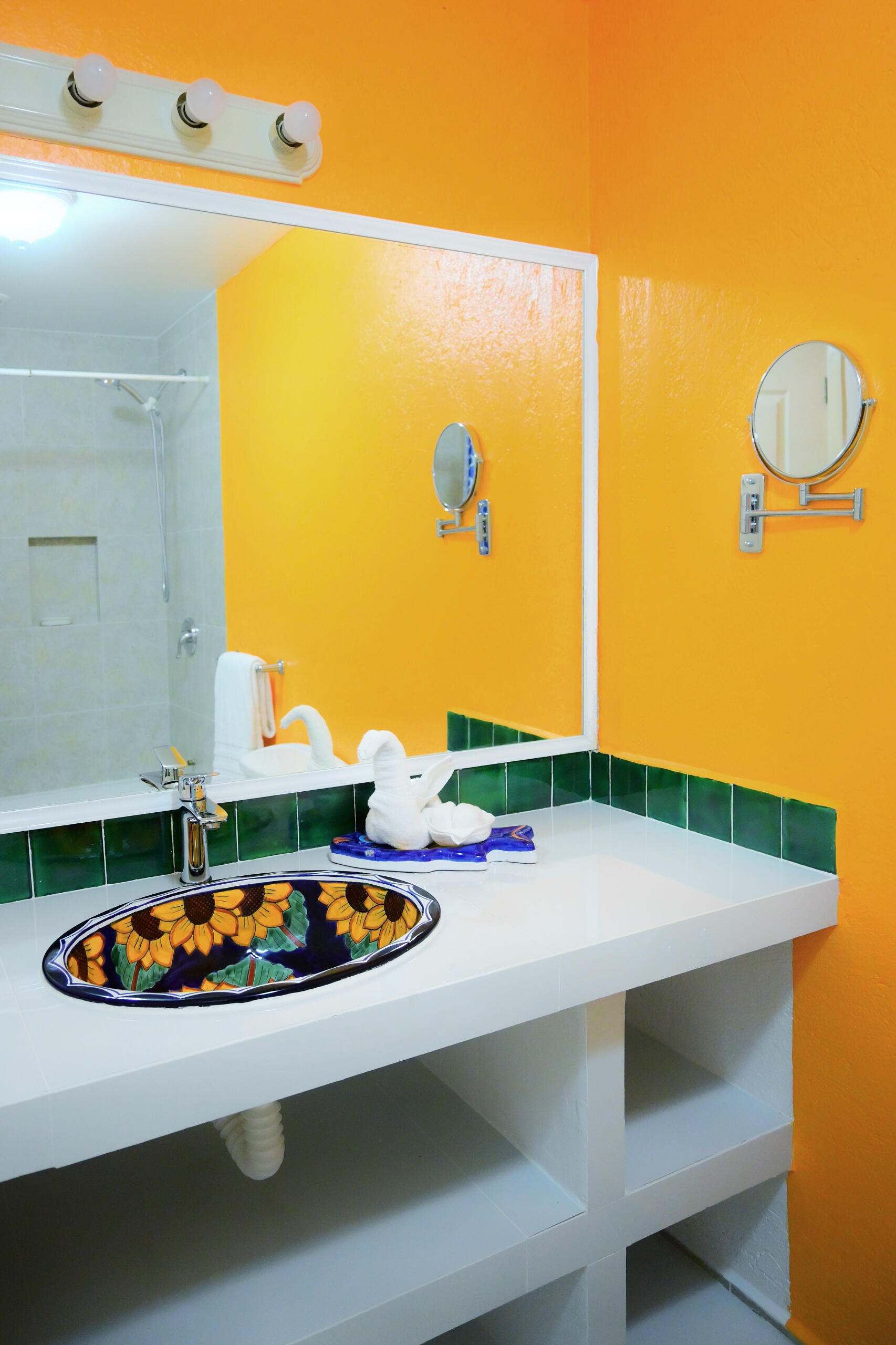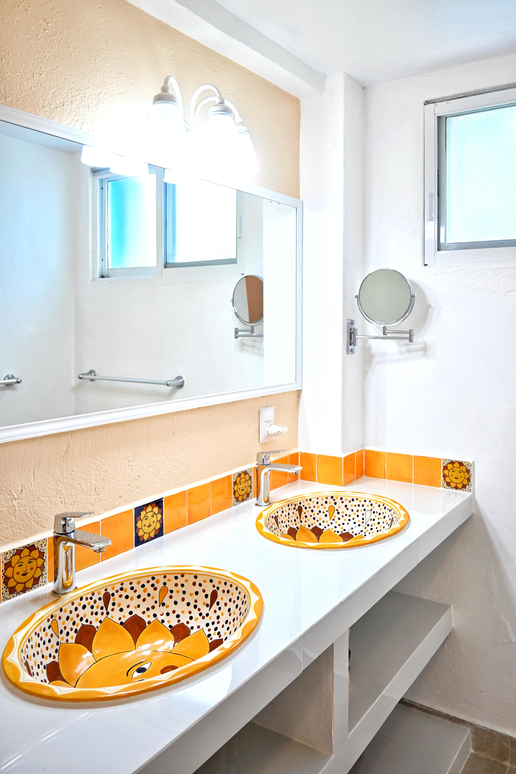 With an abundance of natural light, the ensuite provides dual Talavera sinks & accents, and an oversized shower with a bench.